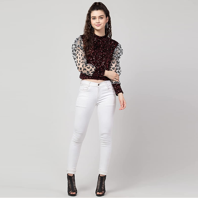 Making your party more glittery. Having the bottom of each sleeve covering in glittery work, it comes in full sleeves making it appear more fashion-appropriate. It’s also easy and comfortable to wear all day long. It is an extremely popular choice for women’s party clothing when the temperature soars.