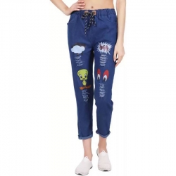 Cute Cartoon Print Girls Blue Denim Joggers Jeans